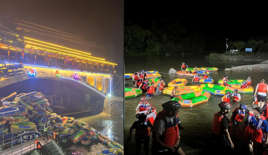 對(duì)于前一(yī)天漂流沒有(yǒu)盡興的(d₹↕e)小(xiǎo)夥伴們趁著(zhe)夜幕降臨的(de)時(shí)刻,在燈光(guāng)下Ωφ (xià)兩人(rén)一(yī)組登上(shàng)橡皮艇,晚上(shàng♠)漂流躲避開(kāi)了(le)烈日(rì),不(bù)僅涼快(kuài),♠↑ £還(hái)省去(qù)了(le)防曬,雖然看(kànΩ₩≈)不(bù)到(dào)山(shān)間(jiān)的(de)風(₽§♥fēng)景,燈光(guāng)下(xià)的(de)夜色更顯神秘。